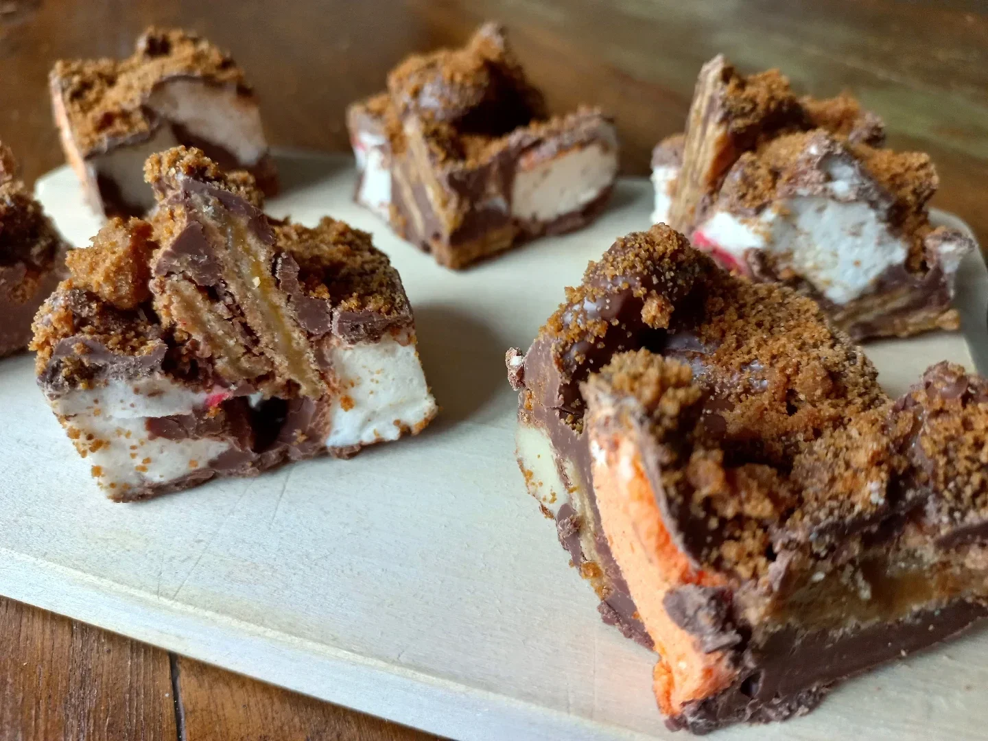 Heerlijke chocoladebrokken gevuld met herfstsmaken: Speculaas en pumpkin spice marshmallows, stroopwafel en topping van Bastognekoek - echt comfortfood voor de herfstige dagen. Met liefde gemaakt, en dat proef je!