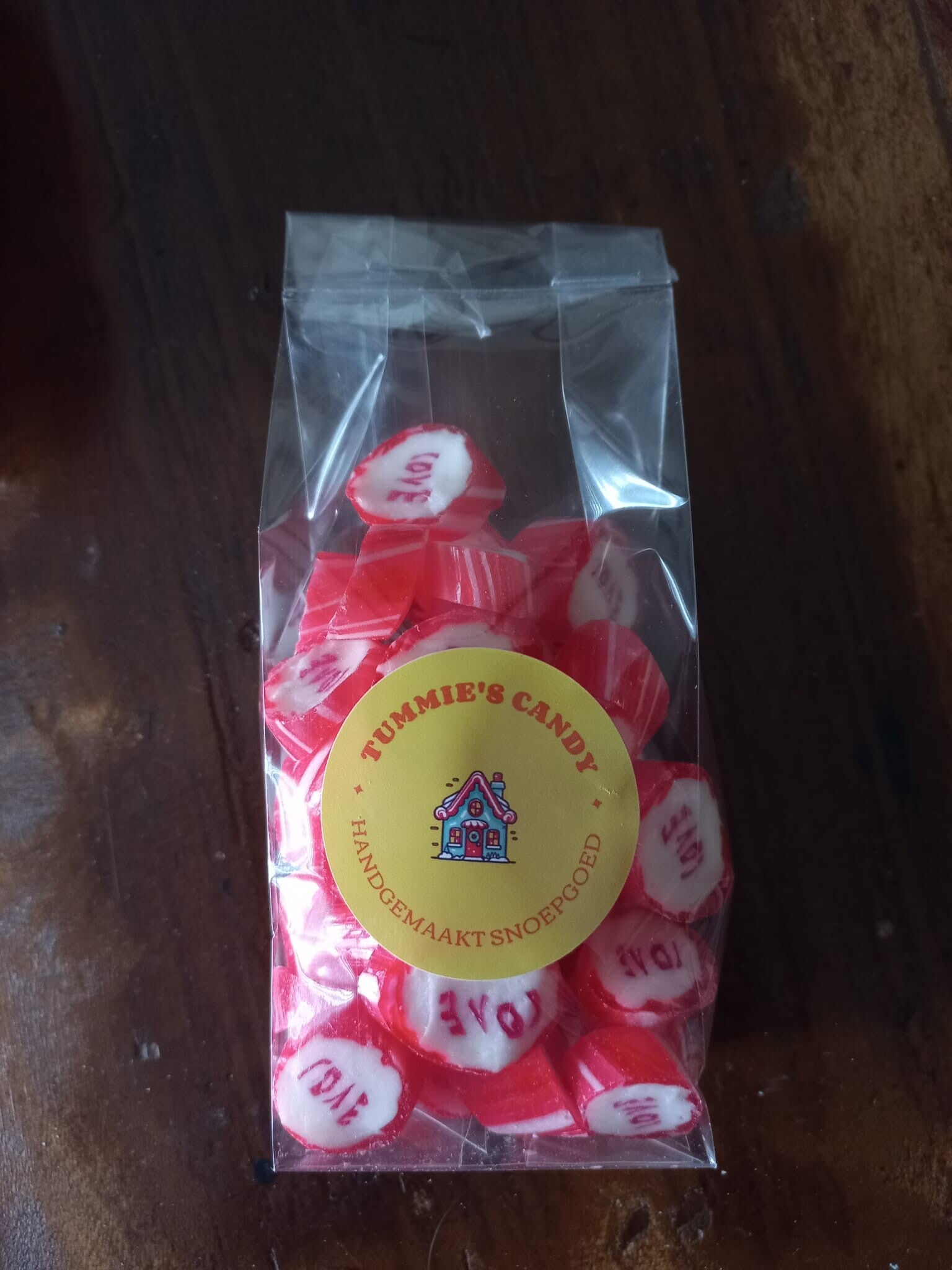 Vier de liefde met deze heerlijke zuurtjes met 'Love'-tekst en aardbeiensmaak. Met de hand gedraaid, met liefde gemaakt!